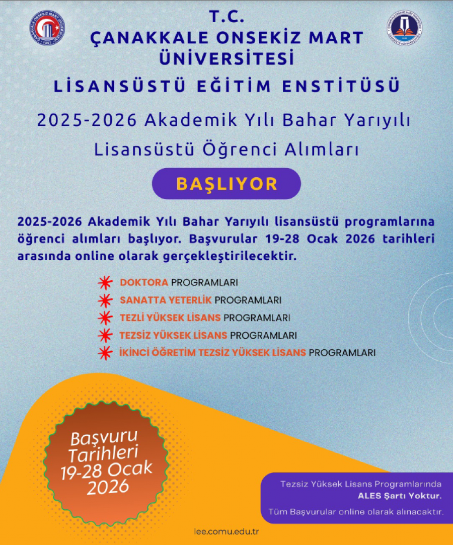 14 Ocak 2026 tarihinde 10:30-12:00 saatlerinde tek oturum olarak Terzioğlu Yerleşkesi Yabancı Diller Yüksekokulunda yüz yüze yapılacak Lisansüstü Eğitim Enstitüsü Yabancı Dil Sınavı başvuruları çevrimiçi olarak alınacaktır. Duyuru linli için tıklayınız.